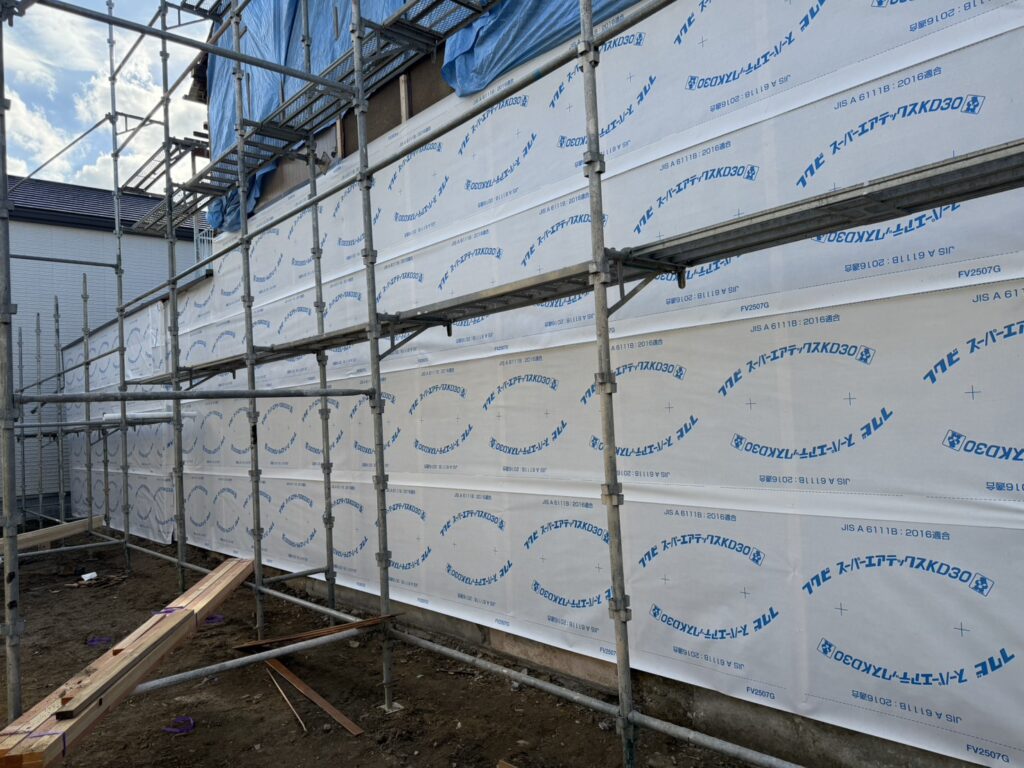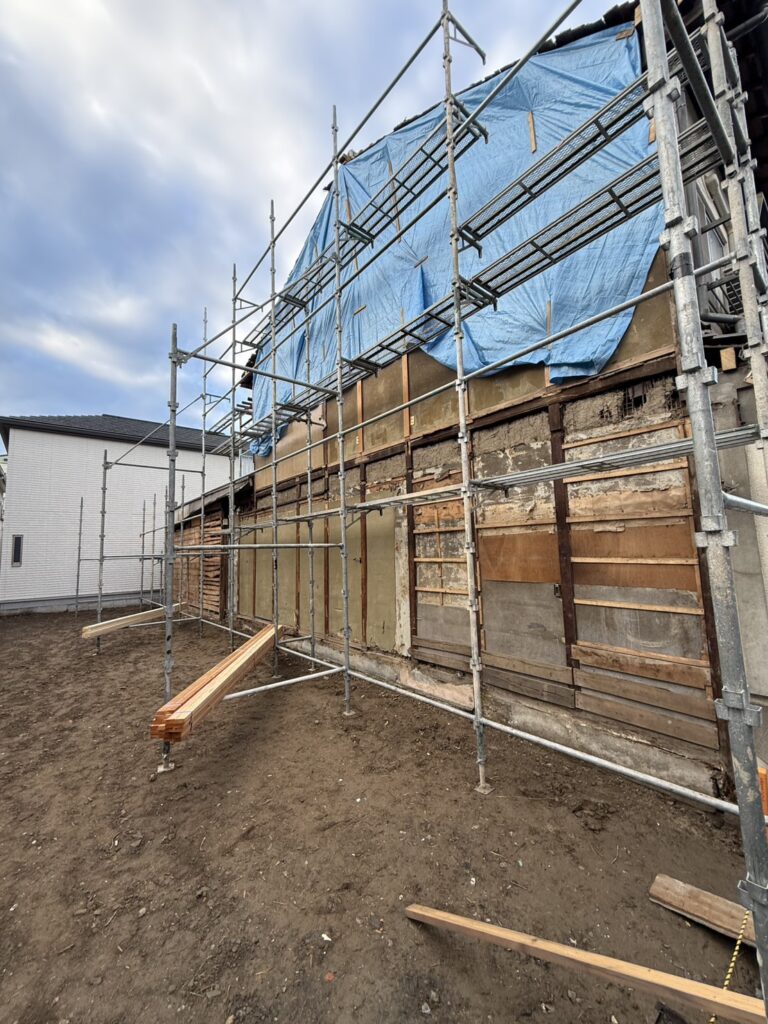 亀岡市での外壁解体後の隣家補修工事では、既存の老朽化した外壁を撤去した後、下地から丁寧に補強を行い、高性能な断熱材と新しい外壁材を施工しました。